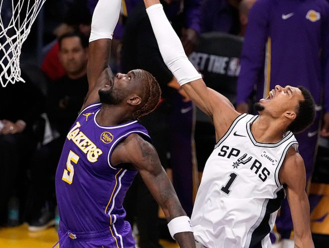 海斯和艾頓輪流上分,打停馬刺。中段索漢轟進(jìn)三分球,東契奇上籃+八村塁三分球追到只差2分。決勝時(shí)刻,東契奇和文班亞馬輪流罰球,東契奇撤步三分球打破平衡,文班亞馬被包夾只能給隊(duì)友傳球,但手感不好。此后文班亞馬進(jìn)攻犯規(guī)6犯離場(chǎng),心態(tài)有些失衡,艾頓繼續(xù)罰球,斯瑪特兩罰全中拉開4分分差后,奧利尼科上籃維持懸念。危急時(shí)刻,斯馬特踩線發(fā)球給馬刺最后一攻機(jī)會(huì),拉拉維亞推人犯規(guī),尚帕尼第一罰打鐵,最終湖人118-116驚險(xiǎn)擊敗馬刺。